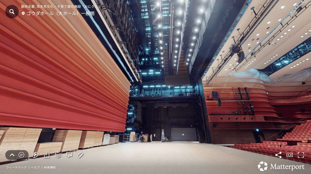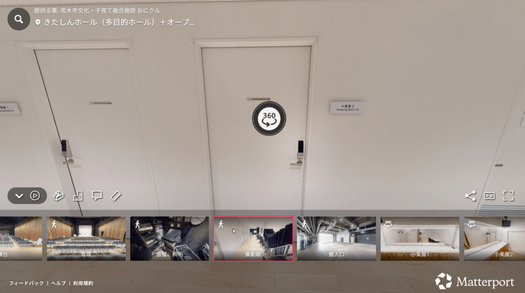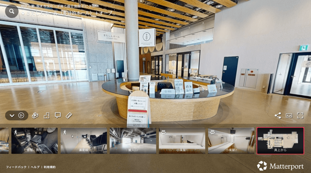 おにクルの公式サイトでもバーチャルツアーの埋め込みが進められており、貸館の問い合わせページにも掲載される予定です。